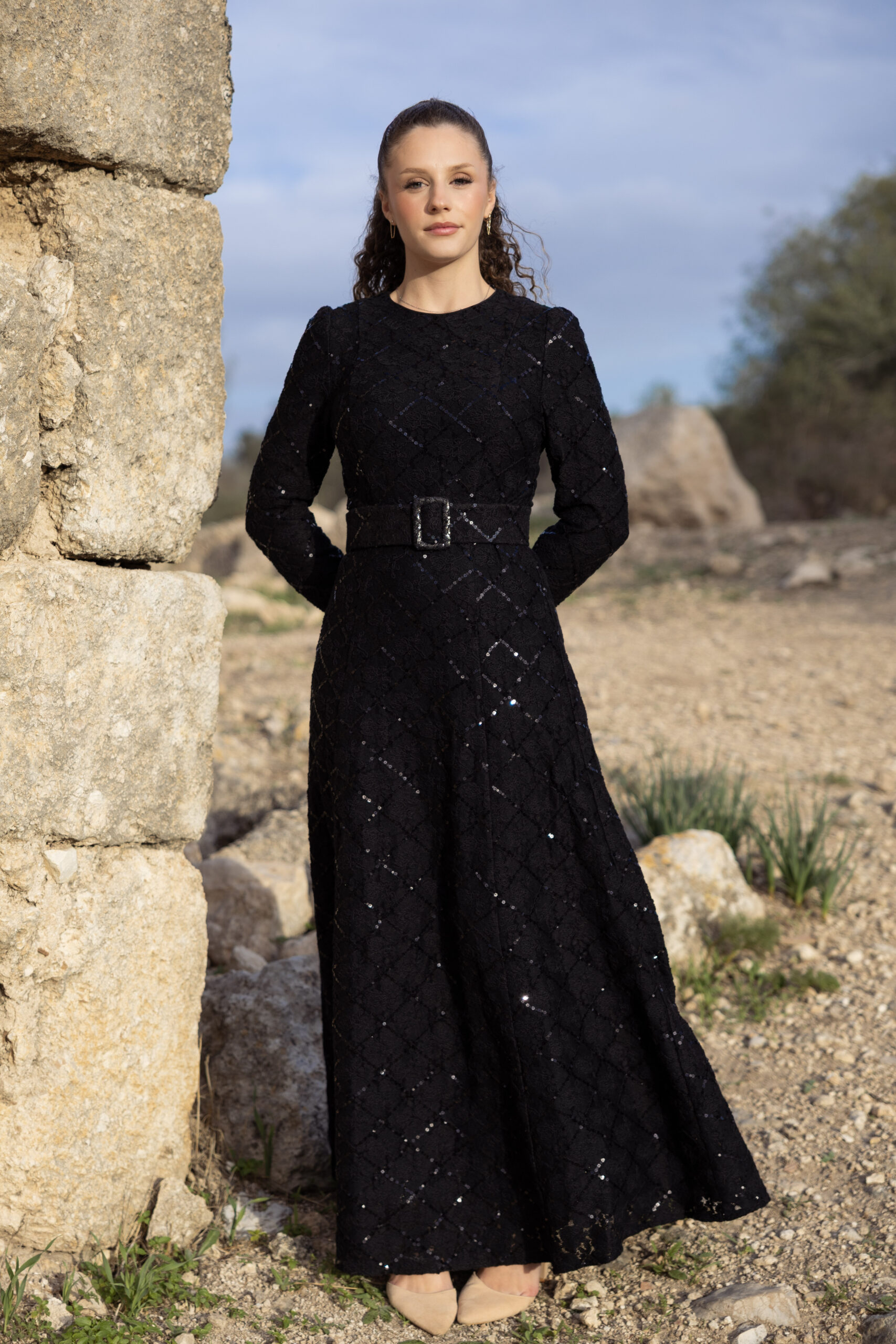 שמלת מקסי שחורה מבד גפיור עם פאייטים עדינים היוצרים דוגמת רשת